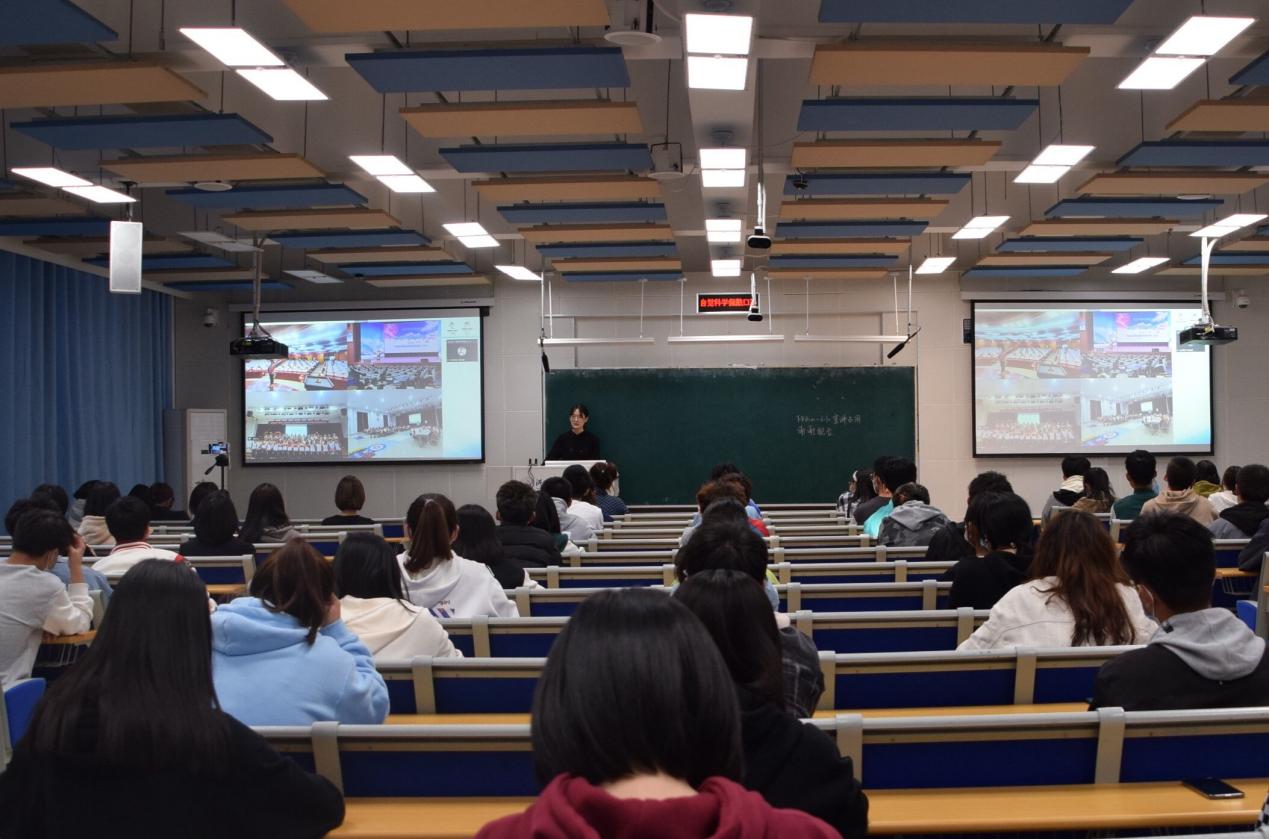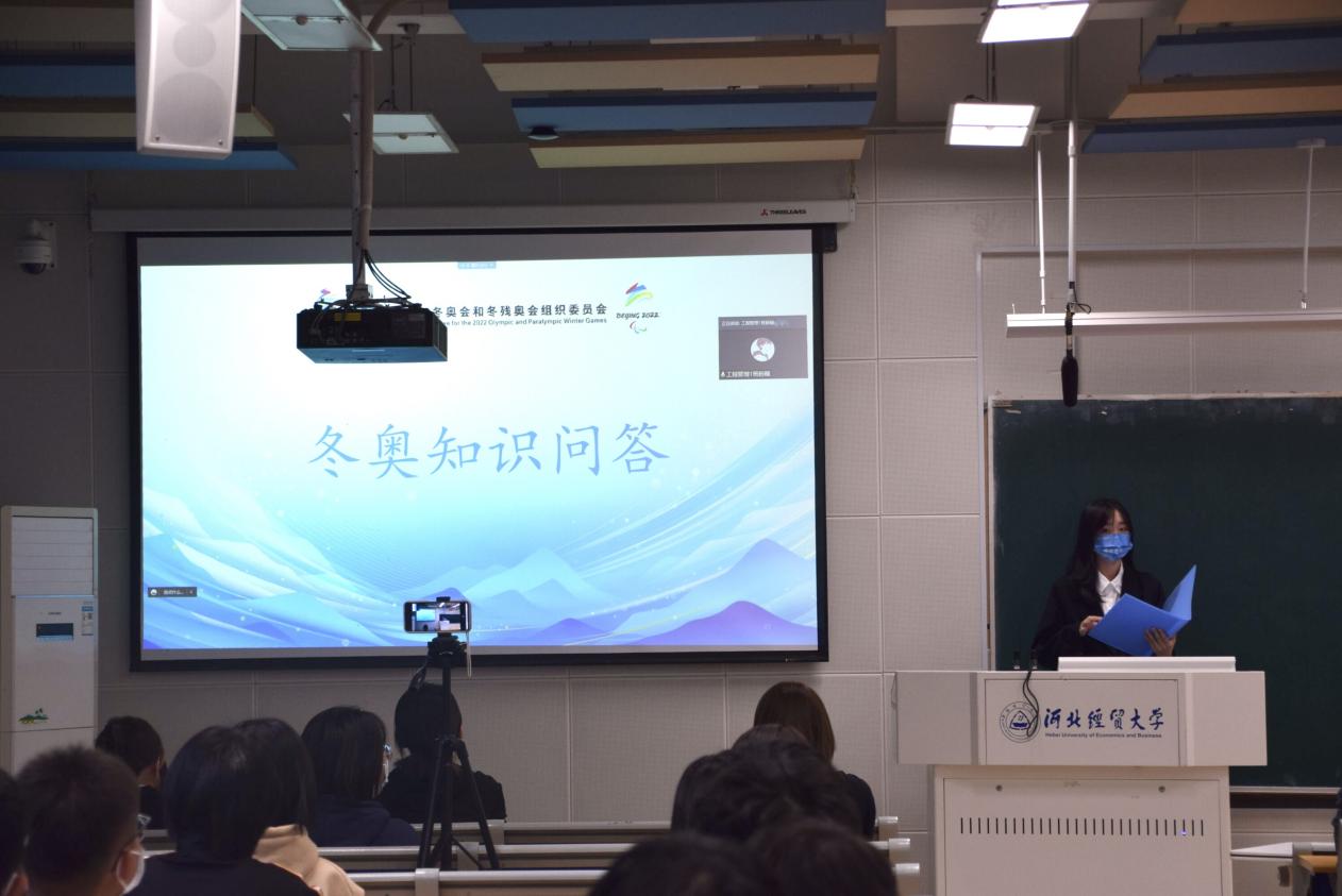 活动伊始,张家口山地新闻中心防疫志愿者韩赛超分享了自身的冬奥故事和志愿心得,她讲到,此次冬奥志愿经历使她认识了更多优秀的人,提高了自身能力水平,实现了自我价值。场馆媒体中心志愿者张赛介绍冬奥志愿服务内容,她详细介绍了场馆内容、赛前准备、赛时工作、隔离生活以及自己的感想。她告诉同学们,此次冬奥志愿丰富了她的个人阅历,锻炼了协调组织能力,同时也让她认识到了志愿服务的重要性。活动期间还进行了冬奥知识抢答,播放了冬奥主题曲《一起向未来》,现场气氛热烈,同学们在互动交流中了解了更多的冬奥知识,激发了同学们的爱国热情和报国志向。