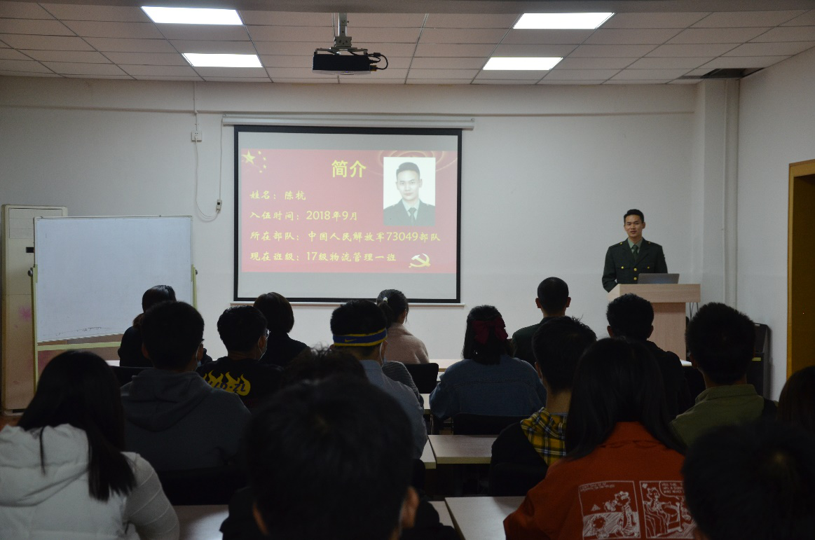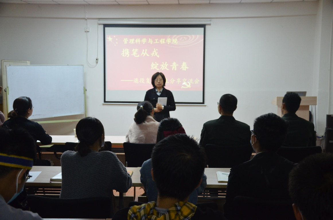 10月26日晚,管理科学与工程公司在第一教学楼408举办了“携笔从戎,绽放青春”退役复学员工分享交流会,公司党委副书记田蓁子,团委书记张艳娥,辅导员王芳以及退役兵陈杭、王鸿鑫出席。本次交流会采用线上线下相结合的方式,2020级全体新生通过腾讯会议平台在线上观看。