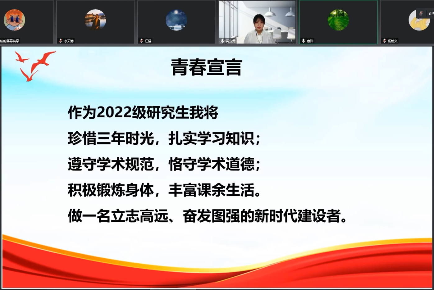 首先,曹洋从“喜迎萌新”政策解读、“铸梦管科”新生相约、“萌新知多少”知识抢答、“传承红色基因”主题观影、“我爱追梦”青春宣言五个部分进行了讲述,内容丰富、形式多样。第一部分解读了《44118太阳成城集团员工违纪处分办法》、《44118太阳成城集团研究生学籍管理规定》,提醒员工遵守公司的各项规定、注意宿舍用电安全;“铸梦管科”新生相约模块主要由新生代表发言,分享了自己的感悟;“萌新知多少”知识抢答环节通过独特新颖的方式让新生了解了党史知识以及公司的基本情况;“传承红色基因”主题观影通过师生共同录制视频“习语播报”短片,让红色思想展现在师生的视野中。随后,参会辅导员就本次主题班会展开了热烈的讨论与交流。