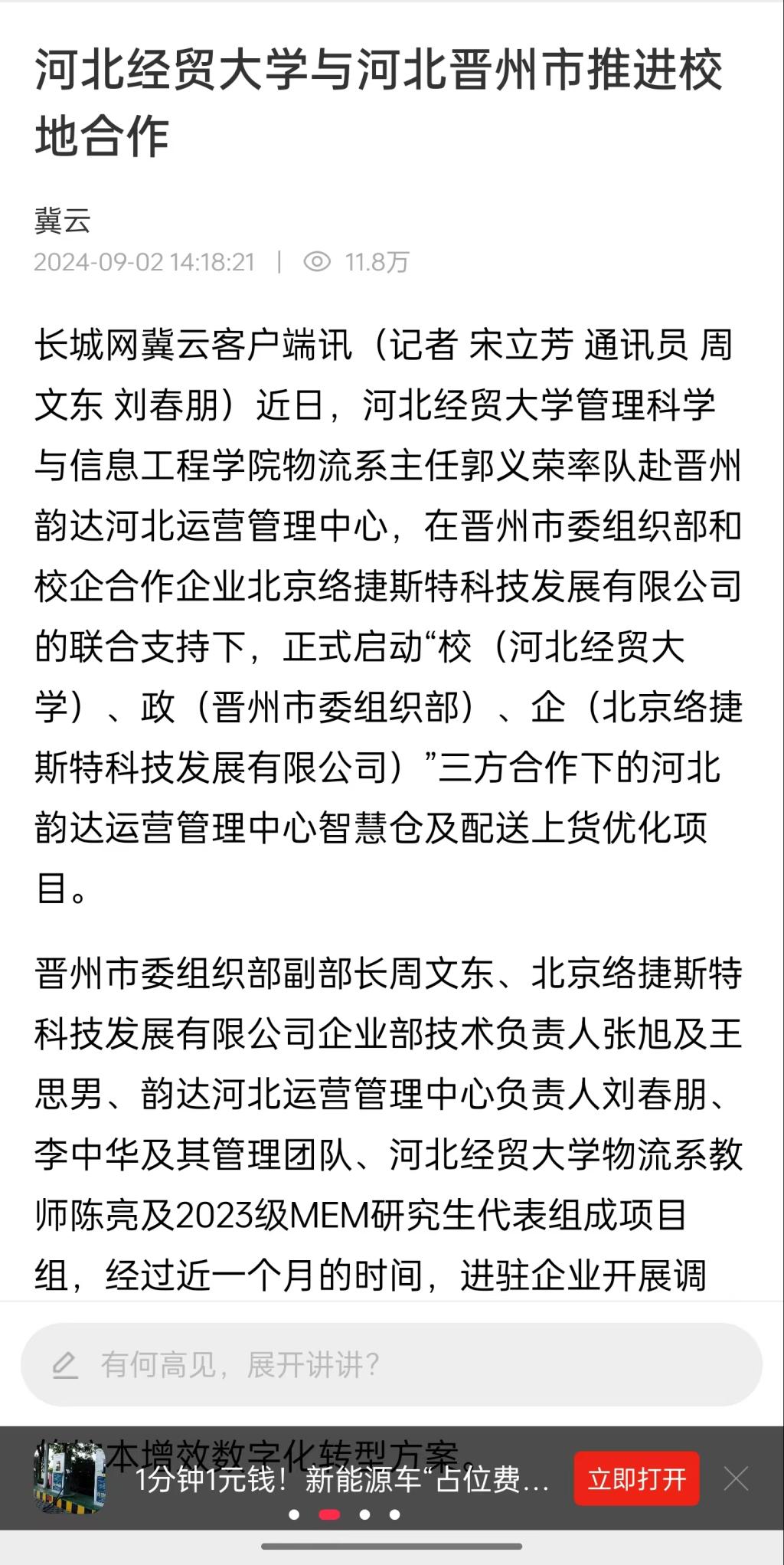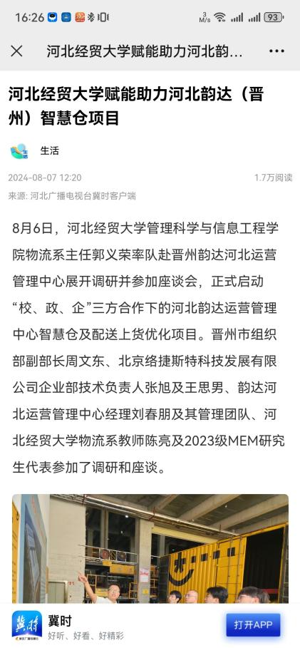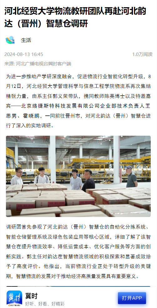 4.河北广播电视台冀时客户端:44118太阳成城集团物流教研团队再赴河北韵达(晋州)智慧仓调研。https://web.cmc.hebtv.com/cms/rmt0336_html/0/0rmhlm/mt/sh/fbt/11585416.shtml?share=true
