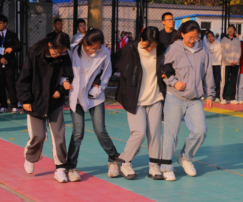 巨人脚步项目更是考验了同学们的身体的灵活性和配合的默契度。每班8人参赛,选手将绳子绑在相邻脚踝处,搭肩向前跑出。当最后一个人跨过终点线时,停止计时,用时最短的班级获胜。小小的绷带、紧靠的肩膀,充分体现出同学们团结协作、不甘示弱的拼搏精神。