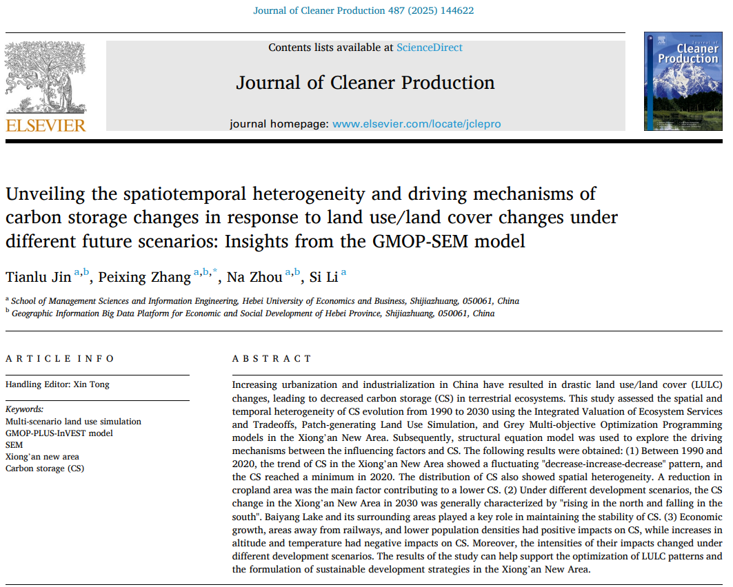 2025年新年伊始,公司研究生导师张培兴指导其2023级硕士研究生靳天禄以“Unveiling the spatiotemporal heterogeneity and driving mechanisms of carbon storage changes in response to land use/land cover changes under different future scenarios: Insights from the GMOP-SEM model”为题在中科院1区TOP期刊《Journal of Cleaner Production》上发表了该项成果。44118太阳成城集团为第一完成单位,张培兴为该论文的通讯作者。
