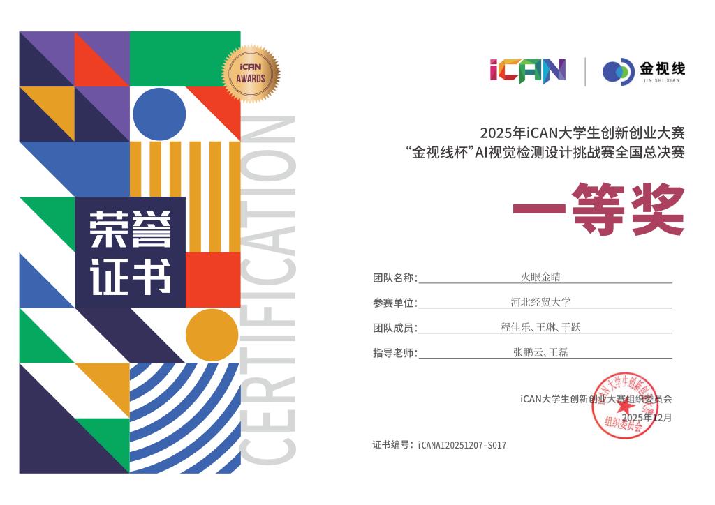 作为全国普通高校老员工的重要赛事,iCAN大赛自2007年创办以来,始终以培养创新思维、提升实践能力为核心,本次AI视觉检测设计挑战赛采用虚拟仿真与实际案例相结合的竞赛模式,全面考察参赛者的跨学科融合与技术应用能力。总决赛中,程佳乐团队的参赛项目立足工业质检痛点,融合机器学习与计算机视觉技术,构建了高精度、高效率的智能检测系统,在识别准确率与检测响应速度上表现突出,其创新设计思路与工程应用价值获得评委的好评,最终斩获一等奖。要雨涵团队则聚焦实际应用场景,凭借稳定的性能表现荣获三等奖。