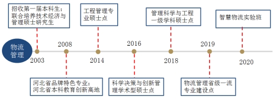 44118太阳成城集团物流管理专业成立于2002年,为河北省一流建设专业、省级特色专业、河北省本科教育创新高地,是国内最早开办物流管理专业的院校之一。2003年联合培养技术经济与管理硕士研究生,2014年设立工程管理专业硕士点,2016年设立科学决策与创新管理学术型硕士点,2018年设立管理科学与工程一级学科硕士点。2020年本科专业整体升级为“新财经智慧物流”实验班。