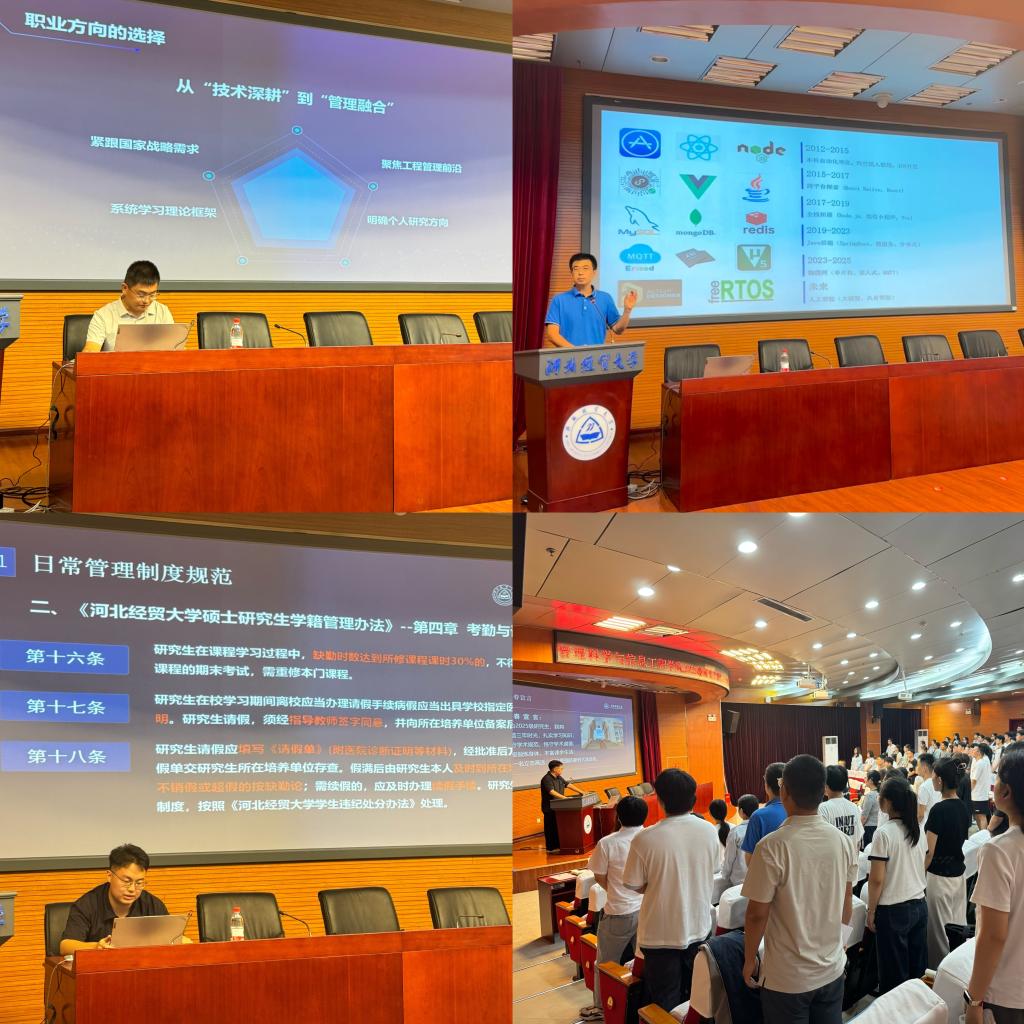 25级薛明伟、徐赢、张桉飒与大家进行研究生朋辈交流活动。薛明伟结合自身从“工程师”到“研究生”的转型历程,建议新生“主动梳理过往技能与当前研究方向的关联点。徐赢强调了持续学习的重要性,在科研领域积极迎接变化,顺应时代发展。院研会张桉飒从“日常管理制度规范”“研究生服务工作”梳理并指出了研究生容易遇到的问题。最后全体新生以青春的名义进行宣言,激荡人心。