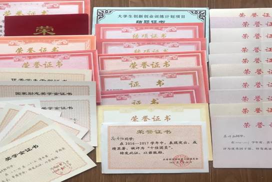 校级优秀员工干部、校级优秀团干部、校级十佳团员、自强之星提名奖、两次优秀员工信息员、两次社会实践优秀成果奖、五次社会实践先进个人奖、两次”优秀团员”称号;