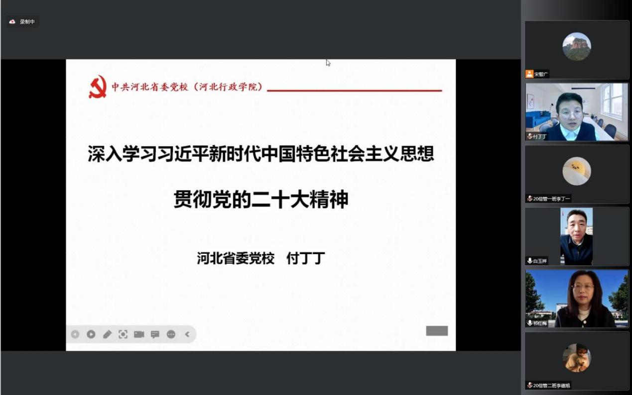 付丁丁向公司师生介绍了党的二十大的核心内容,阐释了党的二十大胜利召开的深远意义,并结合习近平总书记在正定工作时的工作经历,从经济发展、文化自信、全面从严治党、国家治理四个方面,回溯了习近平新时代中国特色社会主义思想的源头。付丁丁在讲座中用了大量详实的数据及鲜活生动的事例,所讲内容既有理论高度、又有实践深度,生动形象,深入浅出。
