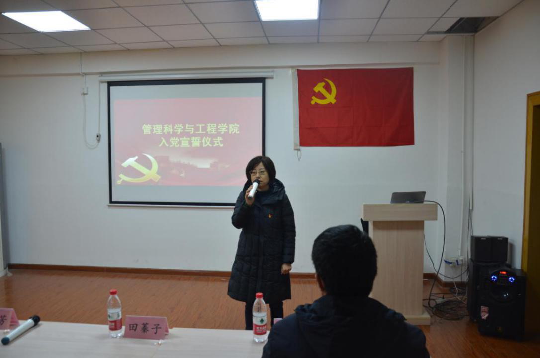 公司党务办公室负责人宋智广带预备党员面向党旗进行了入党宣誓。预备党员代表刘锦鑫和正式党员代表王雨丝分别进行了发言。