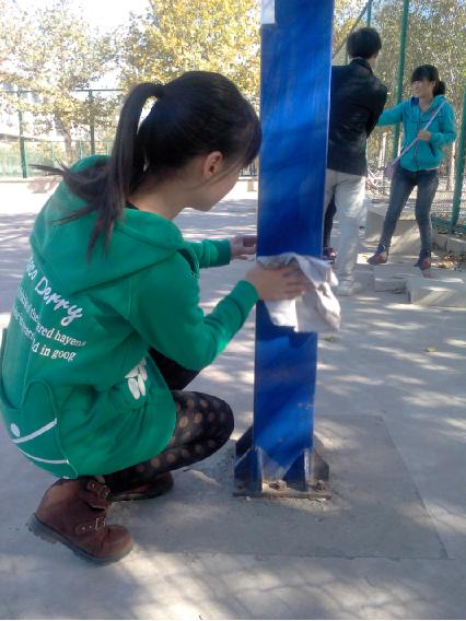 活动中,同学们把轮滑场分成几部分,并进行自我分组。在指定区域内,部分同学用工具清扫路面,部分同学则拾捡烟头,竹签等细小杂物。活动过程中,大家发扬“不怕脏,不怕累”的精神,热情高涨,积极参与,互相配合。在大家的共同努力下,清扫区域焕然一新。为此,同学们赢得了过往师生的赞许。
