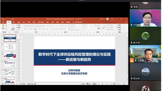 讲座围绕全球供应链风险管理的发展现状和发展趋势展开,在介绍了数字化与数字经济的发展概况之后又详细阐述了全球供应链风险管理的内涵,并通过一汽、京东方智慧物联和联合利华公司等典型案例讲解了如何开展全球供应链风险管理。最后,刘伟华从实践和理论两个视角分享了供应链风险管理的最近研究进展与未来的研究趋势。会后,刘伟华与参会师生就供应链韧性与数字化、京津冀区域供应链稳定与安全以及供应链风险的界定分级和应对机制等问题进行了讨论交流。