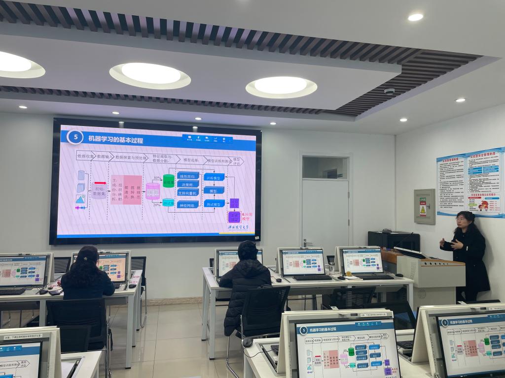 随后,参会教师现场观摩了张霞、李健两位老师关于机器学习模块的教学内容展示。两位老师条理清晰地呈现了该模块的教学思路、重点难点及具体实施过程。针对该模块教学痛点,全体教师集体磨课、优化设计,确定采用案例式教学法升级课程,并明确具体实施路径: