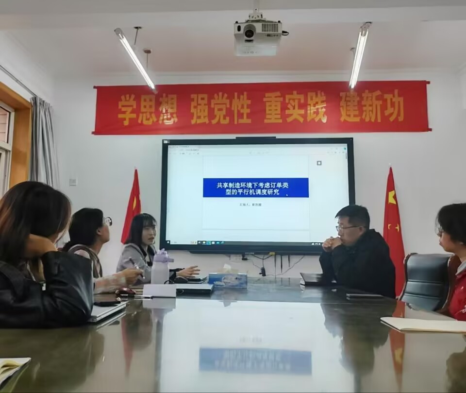 靳凯媛作题为《共享制造环境下考虑订单类型的平行调度研究》的科研讲座。详尽地讲述了将共享平台生产运作抽象成的考虑机器租赁成本的多类型订单平行机调度问题,给出了下届算法、启发式算法方法。会后,会教师展开了充分交流与讨论。