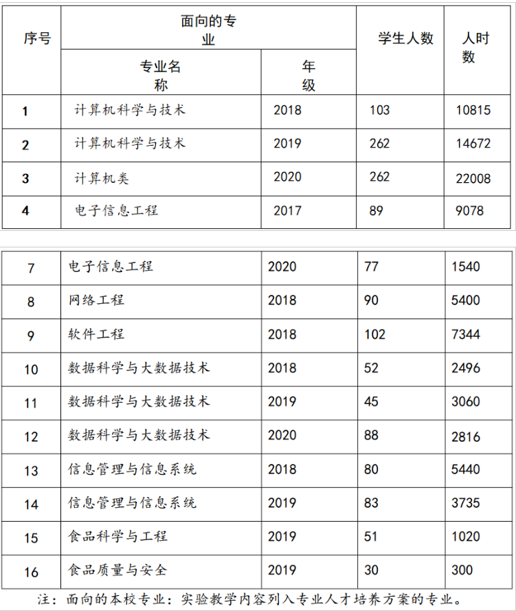信息技术实验示范中心依托计算机科学与技术、软件工程、网络工程、电子信息工程、数据科学与大数据技术及人工智能等6个工科本科专业和计算机科学与技术一级硕士学位研究生专业建设,2020年在校生本科生1634人,研究生30人,为全体员工提供所有课程的课内外实验、专业实训、毕业设计及创新创业训练等环境,同时示范中心还为全校计算机相关专业课程的实践教学提供保障。