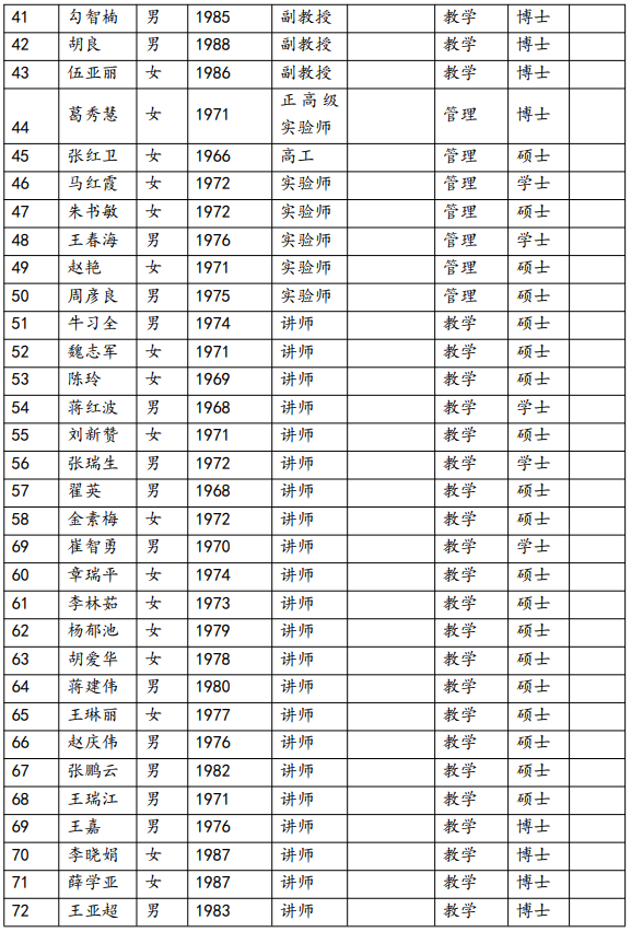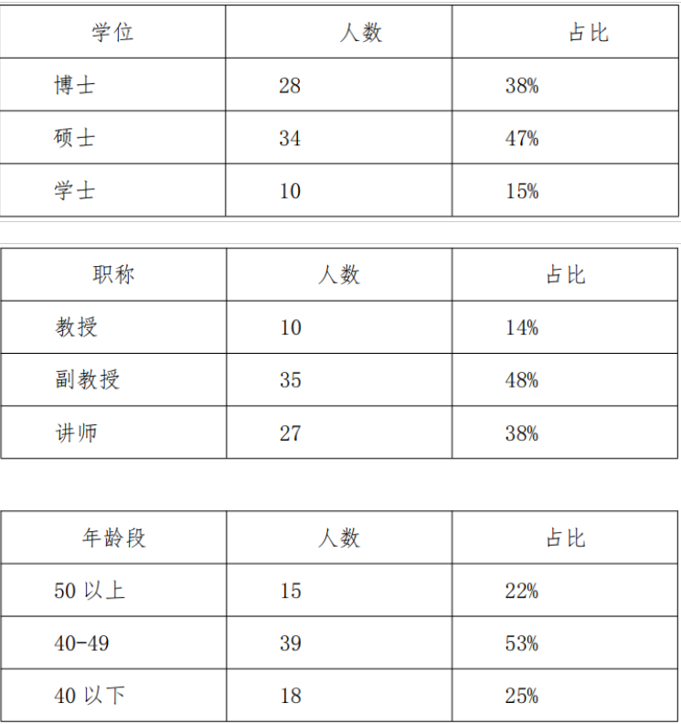 截止目前,示范中心共有教师72名,其中高级职称45名,占比62%。博士28名,占比38% 。